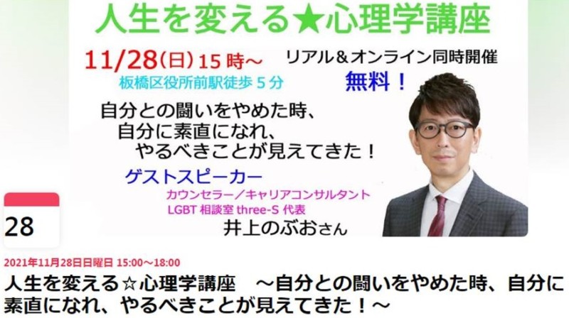 心理カウンセラーの林 真路さんは、困難を乗り越えた方々の体験談を聞く場「人生を変える☆心理学講座」を無料で提供し続けています。お話された方は7年間に80名にのぼります。体験談のあとに林さんが心理学的に解説を加えるのがこの講座の特徴です。この度、ゲストスピーカーとしてお招きいただき、自分の体験をお話させていただくことになりました。タイトルは「自分との闘いをやめた時、自分に素直になれ、やるべきことが見えてきた!」男性同性愛者ゲイとして生まれた私が、どのような壁にぶつかりそれを乗り越えてきたかをお話させていただきます。皆様の感想やご意見も楽しみです。オンラインとリアルで開催いたしますので、どうぞ覗いてみてください。